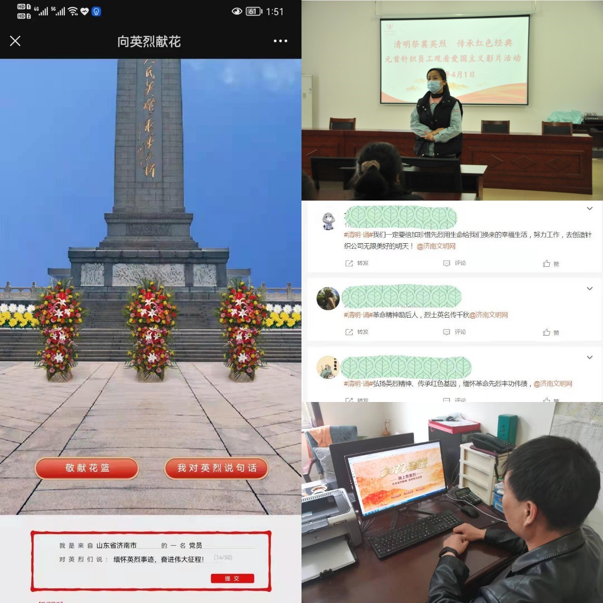 根據疫情防控相關(guān)措施要求,產(chǎn)發(fā)集團直屬企業(yè)濟糧集團、金德利集團、齊魯化纖集團、元首集團、小鴨控股集團等,紛紛加入“網(wǎng)上祭奠英烈”活動(dòng),干部職工通過(guò)學(xué)習革命先烈的英雄事跡,觀(guān)看抗戰愛(ài)國電影,發(fā)表祭祀感言等形式,表達對英烈的感恩和敬仰,體驗了一堂意義深遠的愛(ài)國教育課。