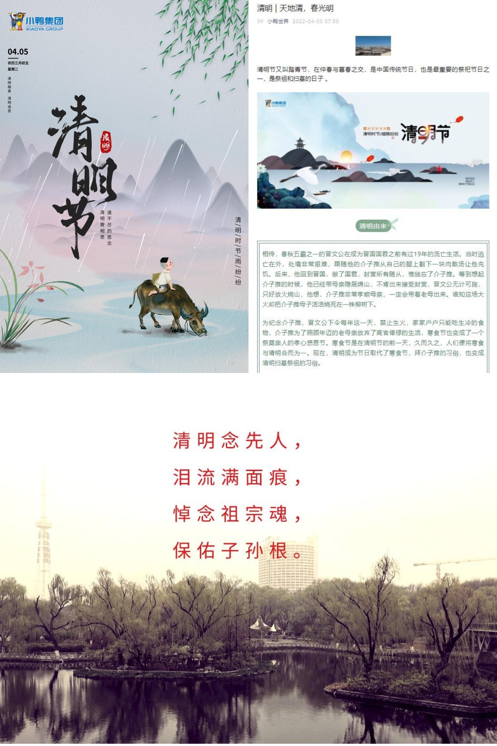 “清明念先人,淚流滿(mǎn)面痕,悼念祖宗魂,保佑子孫根?!薄睦瘓F、小鴨控股集團向廣大干部職工開(kāi)展約稿活動(dòng),廣大干部職工用鏡頭、文字、海報等形式宣傳清明節的歷史淵源與習俗,表達對先人的懷念之情,展現了中華傳統文化,弘揚孝道親情,樹(shù)立科學(xué)文明的祭祀新風(fēng)。