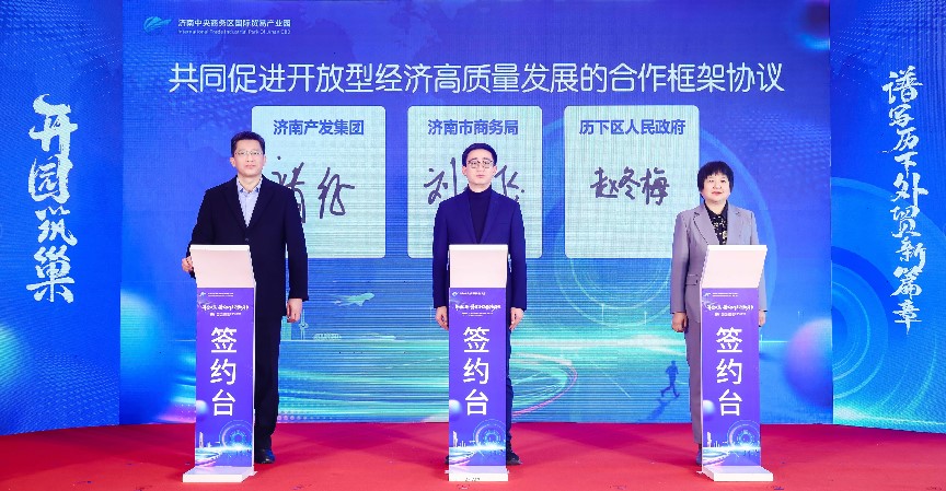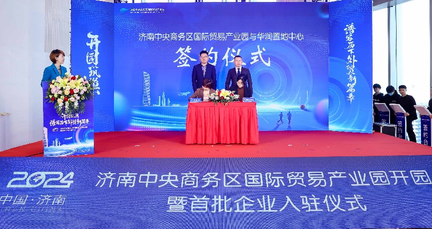 在入駐簽約環(huán)節,濟南國商園區運營(yíng)管理有限公司總經(jīng)理陳蕾與華潤置地中心項目負責人李靜宜簽訂了委托運營(yíng)協(xié)議;劉燕飛、趙冬梅、褚征分別代表濟南市商務(wù)局、濟南市歷下區人民政府、濟南產(chǎn)發(fā)集團共同簽署《共同促進(jìn)開(kāi)放型經(jīng)濟高質(zhì)量發(fā)展合作框架協(xié)議書(shū)》;王紅、楊傳軍、趙治文、楊福濤、王海清、黃蓓、邵丹丹共同按下啟動(dòng)開(kāi)園按鈕,宣告濟南中央商務(wù)區國際貿易產(chǎn)業(yè)園正式開(kāi)園。